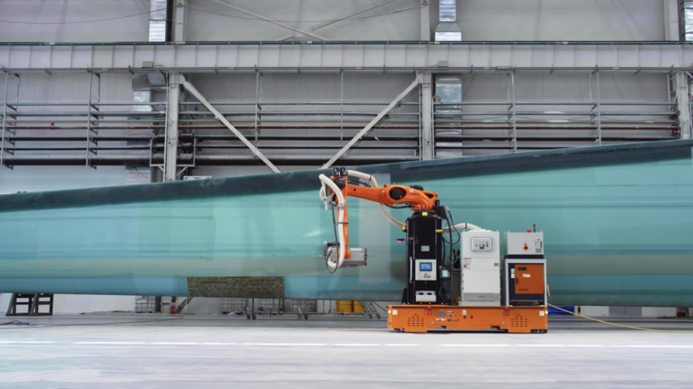 三一重能韶山叶片工厂采用AGV+机器人配合激光引导或者视觉相机引导,实现末端执行工具完成装配、打磨或喷涂等作业,设备可实现自动调整位姿、自动识别叶片外形,并仿形作业。全向运动AGV复合机器人配合激光雷达,实现了作业过程中自动避障,安全高效的作业,使工厂自动化率提升50%,产品质量提升30%。