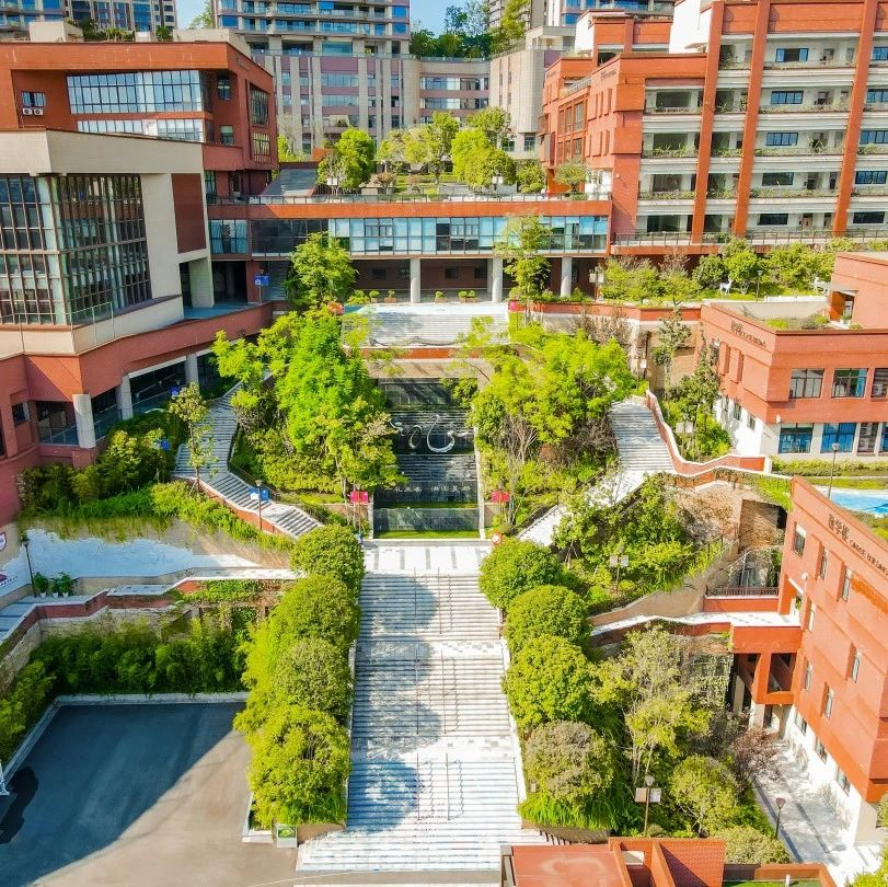 由于学校场地高差大,项目团队在设计时巧妙地运用了山地建筑设计手法。如今,踏入校园,只见窗明几净、绿意葱茏,落差近40米的流水瀑布充满生机与灵动。目力所及之处,尽是美好教育的生动图景。