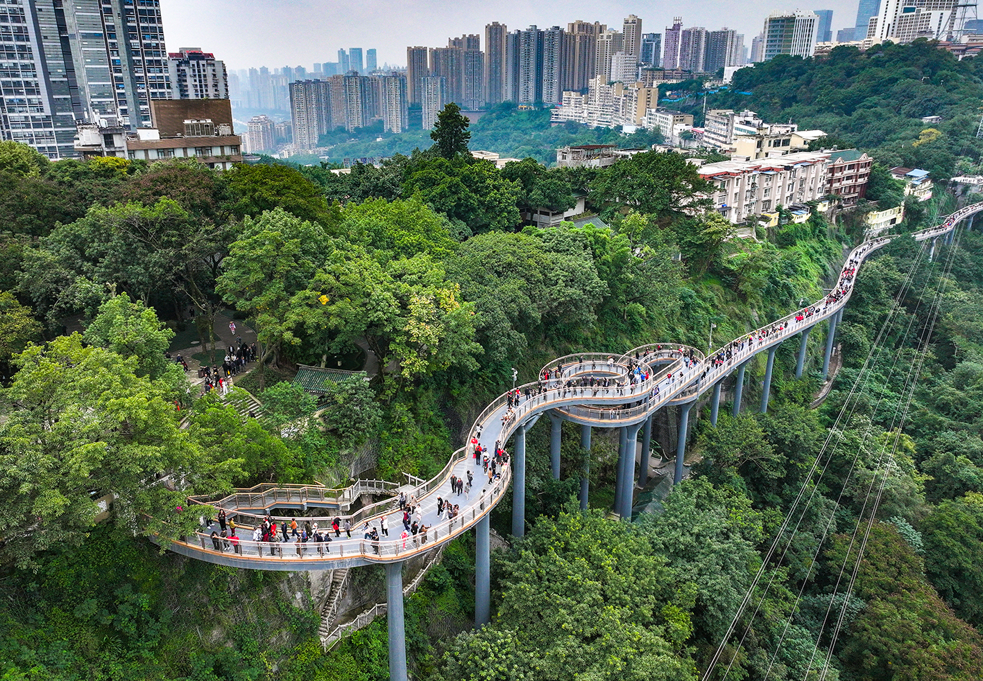该栈桥依托鹅岭公园北侧天然崖壁地形而建,沿山脊线蜿蜒伸展,将鹅岭公园与佛图关公园有机串联,形成一条视野开阔的观江览城步行通道。从空中俯瞰,栈桥如一条轻盈的缎带缠绕于青山之间,与周围茂密的绿植相映成趣,同时为市民提供了,观赏李子坝“单轨穿楼”奇观的绝佳视角。