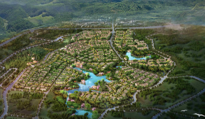 该项目位于缙云山脉和中梁山脉之间的台地上,内有两个天然湖泊,地理环境得天独厚。用地内无可利用的植被,无名树、古树,有可利用的水体。设计原则“创造平缓的大地景观界面,土方就地平衡,避免场地大开挖,建筑的正负零零标高与各自邻近道路一致,利用场地低连处,设置为地下车库,并采用分组团布置,场地高差较大处,利用叠落式绿化处理。尽量利用地形避免大的土石方量。总体构思为通过一条贯穿三宗地块的景观带将整个片区联为一体,并与用地内部的自然景观,湖泊相结合,形成设计的目标——山水大盘。各个理念的展示极具特色又同一协调,整个规划给人留下的强烈印象是:山水环绕、绿意盎然。环境效益的同时提升用地的经济效益,使工程达到功能组织合理、用地配置得当、结构清晰、道路顺畅、配套齐全等要求,创造出“以人为本”尊重环境。
