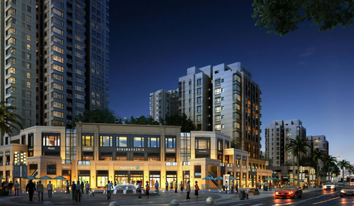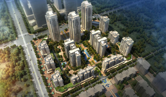 本项目位于大学城板块东侧,项目北侧为城市规划道路,南临科技大道北线,用地东侧为本项目一期住宅区,西侧未来将是现代化商业中心。用地方整, 地形平坦, 总体构思以相邻地块项目主轴线为脉络,城市级规划的统一性为原则,实现城市形象整体打造。同时高层低密度的规划理念与相邻地块洋房为主的规划空间形成城市空间的互动,丰富城市形态。建筑立面为简约法式风格,体量遵从欧式传统建筑的分段划分,保持传统欧式设计精髓。细节设计中,大面积的玻璃与深灰色仿金属墙面,增强建筑的现代感。局部八角窗造型穿插其中,古典语言的现代表达更是增加了建筑风格之间的传承感 。