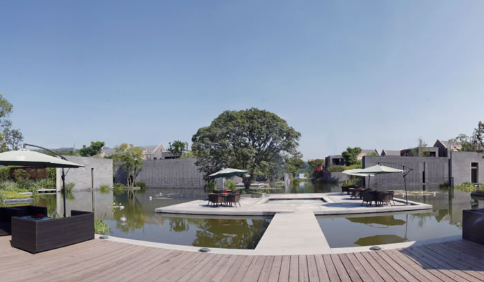 本项目以组团性、庭院式及小尺度的住宅设计元素为出发点,以中国传统风格为基点,以现代设计手法进行演绎,在用地内以庭院为基本元素,形成组团布局,通过各个组团筑成中式空间的肌理;同时在用地内引入水景元素,打造出一条串连起整个区域的核心景观带;在关键空间节点处设计了较大面积的水景,构成了景观主体,塑造出具有现代中式气息的休闲居住社区。