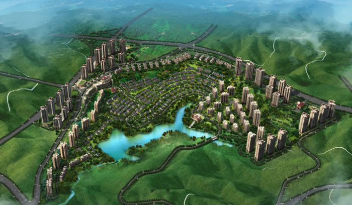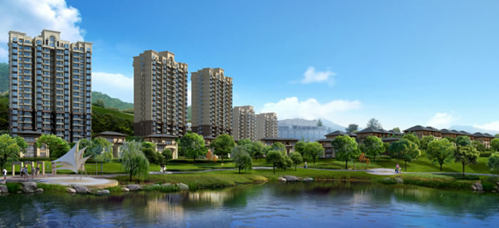 总体布局上以顺应山势为首要原则,尽可能让更多的户数朝向景观良好面。整个地块山势呈环抱状,建筑布局遵循高处高建,低处低建的原则 ,由中心肖家沟水库向北面,东面,南面布局依次为别墅,洋房,小高层,高层。结合地形高差减少各种类型的建筑之间相互遮挡,得到更多的湖景资源。别墅分布于御景半岛,洋房分布:御景半岛,高层分布:翡翠华庭,山水城,御景半岛。
