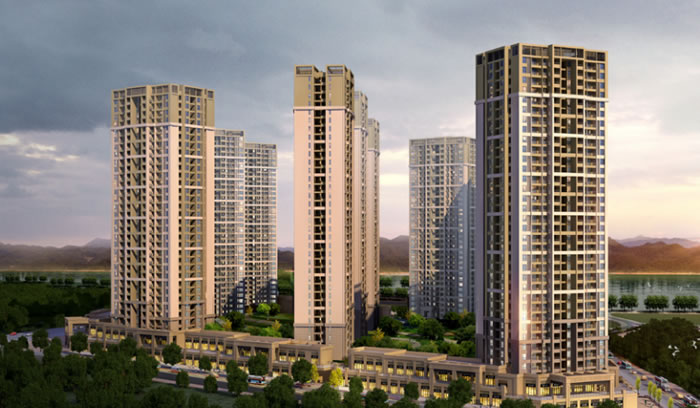 项目地处大渡口未来城市核心西滨路中段,占地约30万m²,总建面约100万m²。项目集品质高层、洋房,滨江商业街以及自建幼儿园、小学、中学为一体,全面升级大渡口高端人居新格局。项目一期占地7.3万方,总建筑面积为34万方;平面布局上,根据小区场地呈平行四边形的特点,规划设计中横向设计一条视线走廊。根据小区地势南北高,中间低洼的特点,整体布局采用南北大围合中间塔式高层点状布置的方式,围合出一个大庭院。利用地势高差,将建筑群划分为西高东低的两个居住组团。