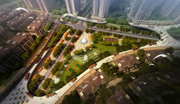 总平面布置将该中心片区分为商业和居住两大功能。具体划分为8#地块主要有高层住区、洋房区和商业建筑;9#地块布置有洋房区,低层住宅小区。另外,8#地块布置有幼儿园。其中高层住宅区布置在8#地块东侧,紧邻东面市政绿地,洋房区布置在悦山路两侧,低层住宅小区布置在地块西面,紧邻会展公园。