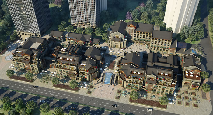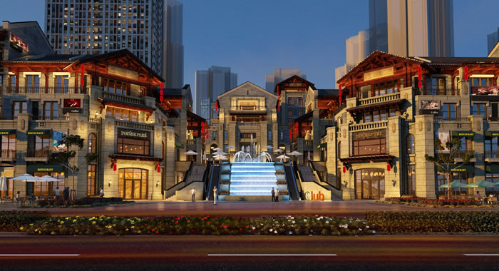 B1、B2号楼风情商业街高低错落的建筑形式为各种经营模式提供多样的选择。中心景观轴末尾结合水池设置一个景观瀑布,使得中轴线空间有一个优美的收头。商业均为沿街的多层商业门面,并设置有商业内街,采用外廊进行连接,外面形成一些凹凸变化的风情骑楼,使商区的整个外部形象充满了诗情画意。