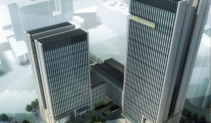 本项目是集车库、超市、办公、酒店、餐饮、运动场所为一体的综合性办公楼。整个建筑是由两个塔楼组成,两个塔楼相互独立、互不干扰,既满足功能上独立管理的要求,又能通过裙房将两栋塔楼有机联系在一起,且两塔之间退让的城市广场将办公楼对城市的压迫和道路对办公楼的噪音影响减少到最低;并且两栋塔楼错开“L”形布置,既减少了视线干扰,同时将2栋塔楼对彼此之间的压迫感减至最低。