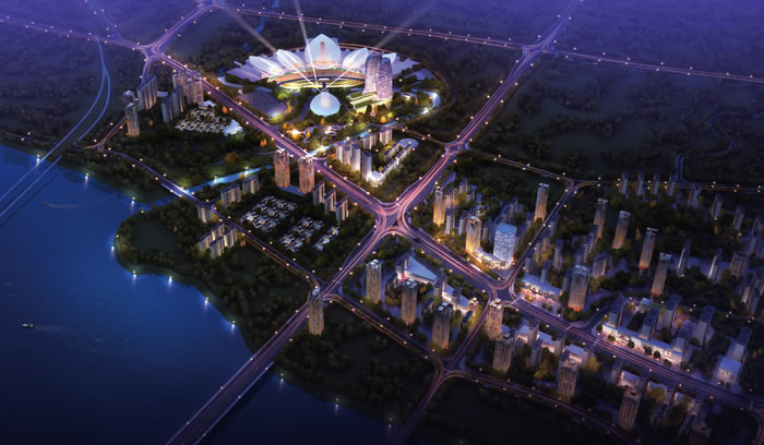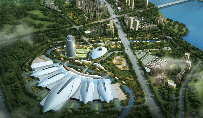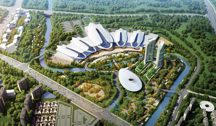 会展核心区分三栋单体建筑组成,分别为会展中心,会议中心,办公酒店商业综合体; 其中会展中心分为地面会展层,地下停车层,夹层办公管理层,以及亲水商业区。会展中心主体部分由5个大 型会展中心,一个大型综合前厅组成,其中最大的展厅为100Mx200M,采用桁架结构体系,最大跨度为50M,建 筑高度为35M,可根据各种需求灵活布展;其他展厅为60Mx120M,最大跨度为30M,建筑高度为25M。会展中心 屋面为银白色金属屋面,前厅玻璃幕墙为桁架体系玻璃幕墙系统,玻璃分块尺寸接近4Mx2M。 会议中由公共大厅,一个2000M²左右的大型报告厅,一个700M²左右的重型会议厅及若干中小型会议室组 成;会议中心采用钢结构桁架体系,底层架空,建筑高度为25M;由金属板及玻璃幕墙包覆。