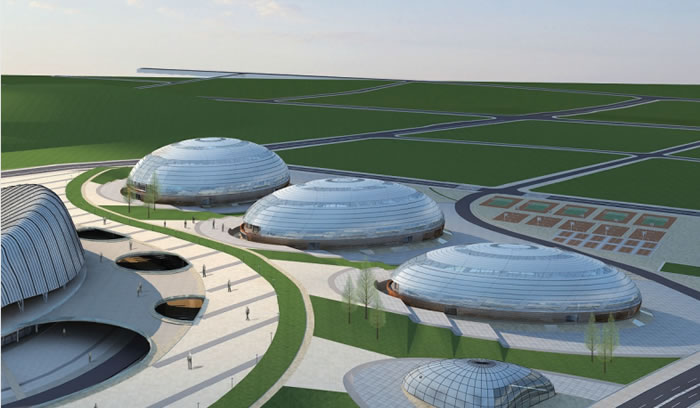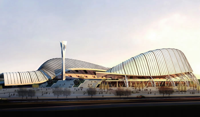 在传统的中国文化中,鱼是吉祥富贵的象征。因此在主体育场的建筑造型设计中,我们从鱼身上抽象出体育场屋顶的造型,使看台屋面犹如两条欢腾的锦鲤从地平线上一跃而起,与自然环境融为一体。其灵动的曲面,在象征了合川鱼文化特色的同时,也体现出一种鱼跃龙门,活力向上的运动生机。其次在体育馆的设计中,其造型则抽象于水滴的形态,蕴含了合川的地域文化特征,同时也体现出一种生命之源的寓意,另外其机理变化的表皮则体现了鱼鳞的意象,使之与旁边的体育场相印生辉。